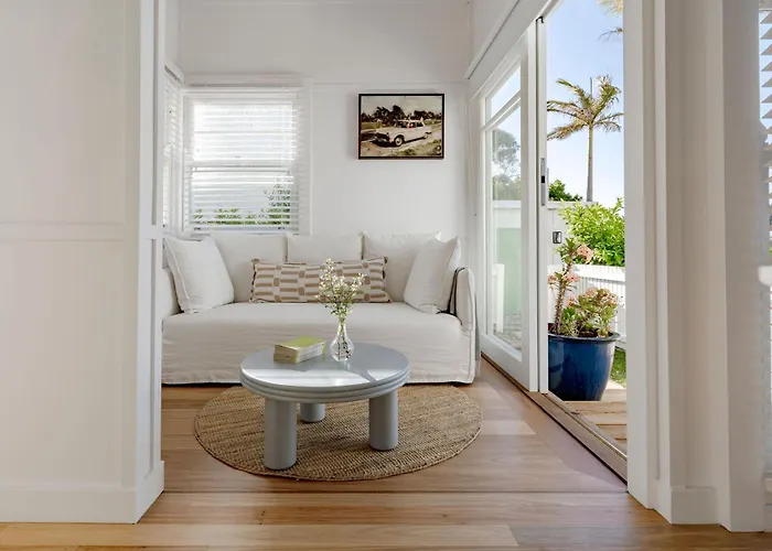 Die Villa The Bunkie @ Ethel & Odes Bundeena liegt am Strand von Bundeena und bietet Gästen die Möglichkeit, sich auf einer Terrasse zu entspannen.